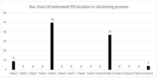 The clustering process will then be applied to the 100 estimated PD localization samples that fall within the IQR, as shown by the 100 unshaded estimated PD locations in Table 3. As shown in Figure 7, the 100 estimated PD localization samples will be divided into 15 classes. Figure 7 depicts a bar chart depicting the estimated PD location during the clustering process. The lowest PD localization value and highest PD localization value from the 100 estimated PD localization samples will be used to determine the class interval as defined in Equation (16).
