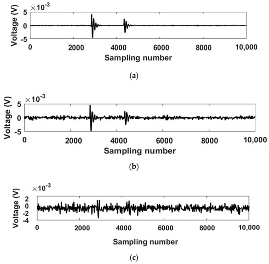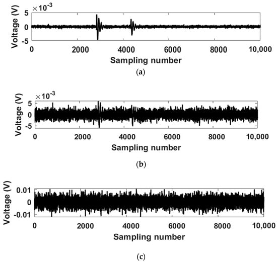 (a) PD signals added with 4 dB SNR. (b) PD signals added with −10 dB SNR. (c) PD signals added with −18 dB SNR.