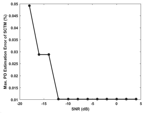 As shown in Table 4, SCTM has the lowest maximum PD estimation error of the three algorithms, with SNR ranging from 4 dB to −18 dB. As the SNR decreased from 4 dB to −12 dB, the maximum PD estimation error for the SCTM algorithm remained constant. After the SNR falls below −12 dB, the maximum PD estimation error increases slightly. The maximum PD estimation error is still less than 0.05% when the SNR reaches −18 dB.