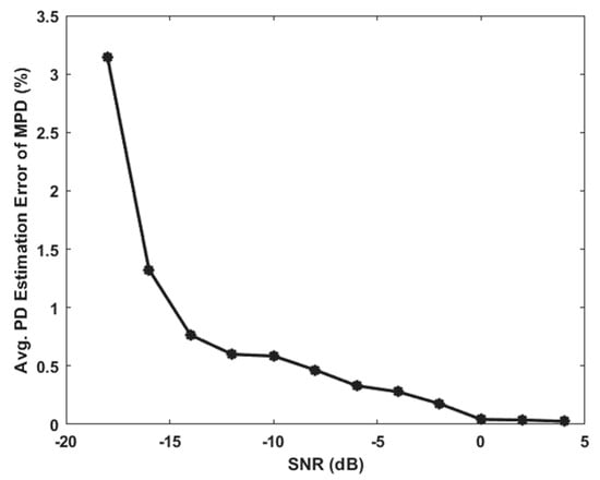 Figure 13 shows the graph of average PD estimation error versus SNR for the MPD algorithm. The average error of the MPD algorithm exponentially increases with the decrease in SNR. Figure 14 shows the graph of average PD estimation error versus SNR for the SC algorithm. The average PD estimation error of the SC algorithm remains low and almost static when the SNR decreases from 4 dB to −14 dB. When the SNR is less than −14 dB, the average PD estimation error of the SC algorithm increases drastically. This characteristic of the graph is also shown in the graph of average PD estimation error versus SNR for the SCTM algorithm in Figure 15. This shows that the SC technique can suppress the average PD localization error until a certain limit, although the noise level keeps increases. When the noise level surpasses the limit, the average PD localization error will increase severely. Although the trend in the SC algorithm and SCTM algorithm are similar in term of average PD estimation error versus SNR, the value of the percentage error for the SCTM algorithm is significantly lower than for the SC algorithm. This is because the SCTM algorithm applies the TMDF technique to further suppress the PD estimation error. The results of the maximum PD estimation error versus SNR and average PD estimation error versus SNR coincidently show that the SCTM algorithm has the highest noise robustness, followed by the SC algorithm, and lastly by the MPD algorithm.