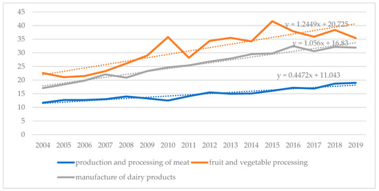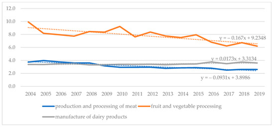 Then, a detailed analysis covered the most energy-intensive branches of the food industry. In order to illustrate the changes in the years 2004–2019 more accurately, the production value was determined in fixed prices for 2019. For these industries, a trend line was defined in terms of the energy intensity of production and the energy intensity of employment.