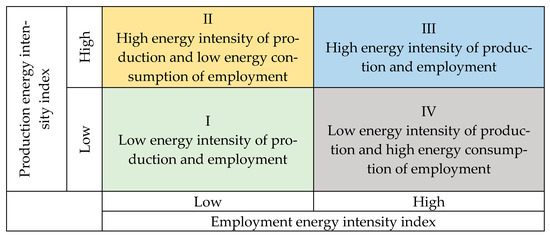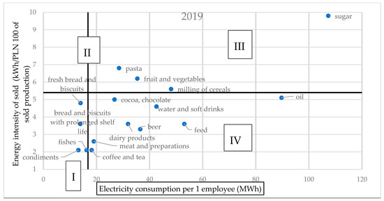 The calculated indicators allowed us to identify the most and least energy-intensive industries in the food industry in Poland. Then, the total energy intensity was calculated by multiplying the obtained energy intensity indicators by the value of sold production and the number of people employed in individual industries. The ratio analysis, comparative analysis, and the method of strategic groups were used in relation to separate branches of the food industry. In the creation of strategic groups, two indicators were used: energy intensity of sold production and energy intensity of employment. In relation to these indicators, a two-level scale was used: low and high. On this basis, it was possible to qualify individual industries to one of the strategic groups in 2014 and 2019 [76]. This solution made it possible to determine the direction of changes in separate branches of the food industry (Scheme 1).