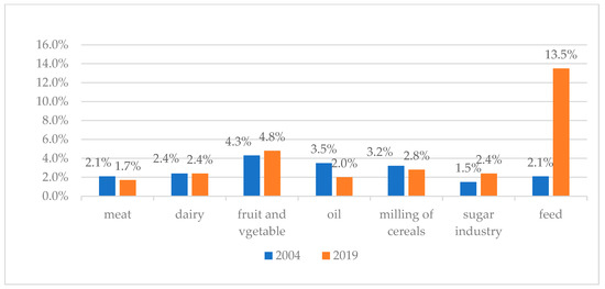 After Poland acceded to the EU, within 15 years, the energy intensity of the food industry increased by 5.1% to 98,515 TJ in 2019, moving this sector to the third place among the most energy-intensive processing sectors, behind companies producing coke and refined petroleum products (252,083 TJ) and chemicals and chemical products (195,911 TJ). The share of the food industry (production of foodstuffs and beverages) in direct energy consumption in manufacturing amounted to 9.6%, i.e., similar to 2004. It was slightly higher than the section producing metals. The increase in energy consumption in the food industry resulted primarily from the increase in sold production by 135% (from PLN 113.5 to PLN 266.2 billion) in current prices and by 91% in constant prices [80]. Significantly, at that time, food industry companies invested in purchasing new, more efficient, and energy-saving machines and devices and introduced more energy-saving production technologies and alternative energy sources (RES).