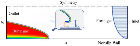 In the present simulations, a variable-resolution mesh is employed [,], offering considerable savings in computing resources. In such a mesh, a subdomain with a higher resolution contains the flame front and the other parts of the calculation domain use a lower resolution, see, for example, Ref. []. Square cells of the size are used in the flame-containing subdomain to ensure a proper resolution of the reaction zone and isotropic flame propagation properties. The grid resolution varies gradually from one subdomain to another along the channel. The total length of the channel L is typically 100 times that of half-width () for eliminating the influence of the inlet boundary condition on the flame dynamics and ensuring that the critical condition can be attained far enough from the inlet. The flame is ignited at the bottom left corner as a sector of burnt gas with radius for each case, similar to Ref. []. The critical condition, at which the flame becomes stagnant within the channel, is attained by gradually adjusting the total flow rate at the inlet.
