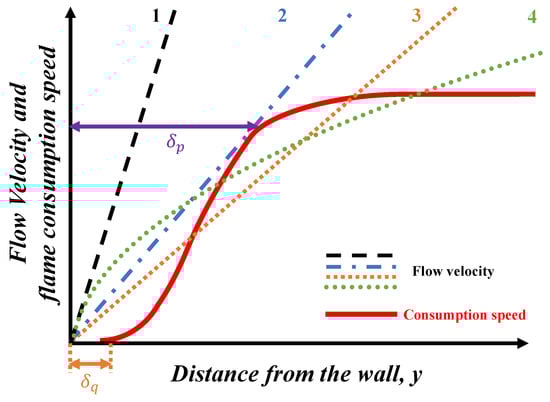 The main idea behind the critical gradient model [,] (abbreviated as CGM in the text) is summarized as follows. In Figure 2, curve 1 corresponds to the case when the velocity of the incoming flow is greater than the flame consumption speed for all y; the flame will be thus blown downstream by the incoming flow. Curve 2 corresponds to the critical condition, where there is a balance of the flame consumption speed and the incoming flow at the distance from the wall. Curves 3 and 4 correspond to a flashback situation when the flame propagates upstream. For the very narrow channels, the velocity profile near the wall may deviate from a linear one substantially, with curve 4 illustrating this situation.