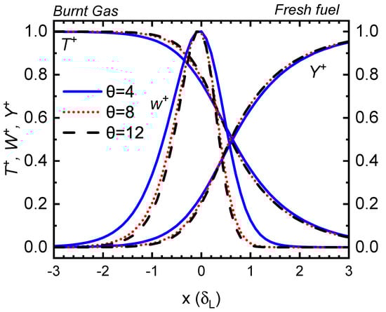 To gain the initial understanding of the influence of the thermal gas expansion on the planar adiabatic flame structure for , we plot the calculated normalized profiles of temperature , fuel mass fraction , and reaction rate in Figure 3. It can be observed that the difference in the temperature distribution is rather small, as well as the difference in the mass fraction profiles, while the difference in reaction rate profiles is more evident. The reaction zone is visibly wider for the lower thermal gas expansion coefficients (see the one for ) and is thinner for the higher values of . It is noted that the scaled activation energy is kept constant. The variation of the reaction zone thickness can be attributed to the variation of the Zeldovich number , which defines the relative thickness of the reaction zone within the standard flame structure []. Here we would like to point out that , as defined in Section 2.1, is a mathematical parameter of length dimension rather than a realistic flame thickness, with the latter typically several times larger than [,].