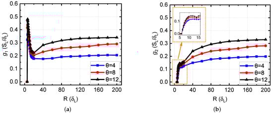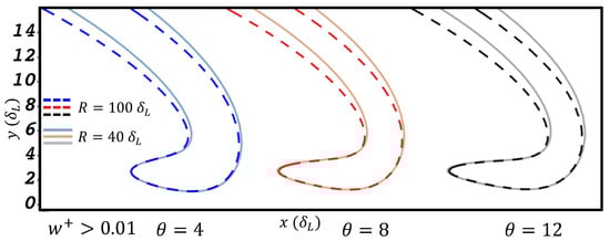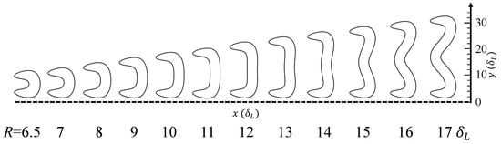 In Figure 11, the flame shapes near the wall are shown for different and two different channel widths under the critical condition. From Figure 11, we can see that at the critical condition (as illustrated in Figure 2) does not significantly change with in the chosen range of R. For the higher , the reaction zone given by looks thinner, which can be explained by the same reasoning as presented in the discussion of Figure 3: the smaller the , the smaller the Zeldovich number , which leads to a thicker reaction zone relative to the total flame thickness. As seen from Figure 11, when flame shapes for different channel widths are overlapped, the flame portion close to the wall remains almost unchanged when R is varied, but the change in results in a more significant elongation of the flame tip.