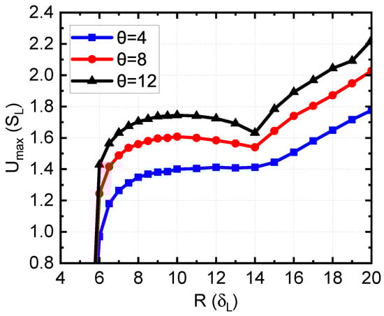 Figure 5 illustrates the dependence of the critical centerline velocity (centerline velocity at the critical condition) on the channel half-width R. A non-monotonic dependence of on R is observed within the range of . In this range of R, the critical centerline velocity first increases and then decreases with the channel width. Comparing Figure 4 and Figure 5, it can be noted that the flame shape change can be correlated with the changes in the trend for the critical centerline velocity . A local minimum in corresponds to the formation of the flame cusp at the centerline. It is worth noting that the higher the gas expansion coefficient , the more prominent is the decreasing trend in the critical centerline velocity in the range .