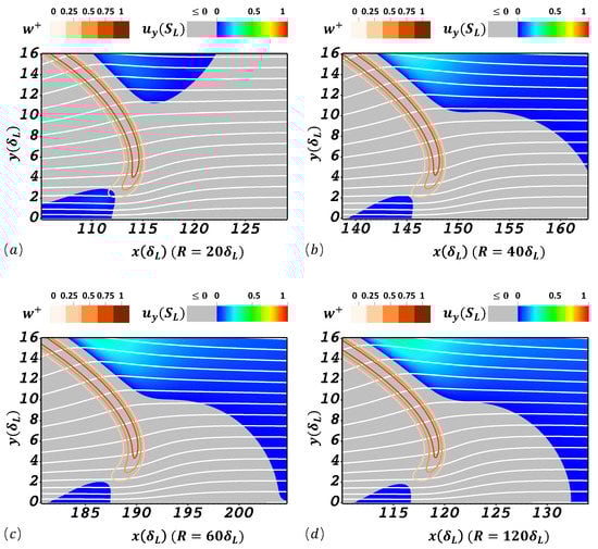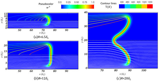 In Figure 6, the flame shape at the critical condition is represented by the normalized reaction rate and temperature isolines for different channel widths. Streamlines are plotted in white. For the smallest channel half-width , the flame is convex at the centerline, and the streamlines are deflected from the centerline towards the walls. For the channel half-width the flame front at the centerline is flat; thus, the flame “tip” is still at the centerline, so qualitatively, it is similar to that of . For , the leading point shifts to the vicinity of the wall, where the flame propagation is able to balance the lower velocity. It can be seen that the streamlines are affected by the flame only within a limited distance ahead of the flame tip at the critical condition.
