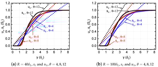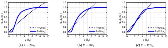 To evaluate the validity of CGM at different , the flame consumption speed and the incoming flow velocity under the critical condition are plotted in Figure 12 for two values of channel half-width, (a) and (b). It is seen that for most cases, there is a disagreement with CGM. It is assumed that if the upstream flow remains unperturbed by the flame, there will be a tangency point for and , as illustrated in Figure 2. From Figure 12a, we notice that for all , exceeds in a certain range of y at the critical condition, which contradicts the CGM. In Figure 12b, there is a visible agreement with CGM for , however, this appears to be a coincidence, as for the other two values of there is no agreement with CGM. From both Figure 12a,b, it can be noted that with an increasing , the slope of will increase at the critical condition, in agreement with the results of Figure 10, while profile will be modified with only slightly for a given R.