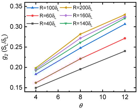 In this subsection, the effects of the thermal expansion coefficient on the flame characteristics at the critical condition are studied for a range of channel half-widths, and for . The dependence of the critical velocity gradient on the thermal expansion coefficient in channels with isothermal walls is shown in Figure 10 for different channel half-widths R. It is seen that the larger the thermal expansion coefficient , the larger the critical velocity gradient for a given channel width. This indicates that the gas expansion at the flame front has an impact on the flow upstream of the flame, promoting the upstream flame propagation and affecting the boundary layer flashback limits.