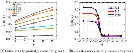 Figure 13 shows the critical velocity gradient for different thermal gas expansion coefficients at the different heat transfer parameters for the same channel half-width . It is seen that with the increase of the thermal expansion coefficient for a given heat transfer parameter B, the critical velocity gradient becomes larger. Comparing the critical velocity gradients for different wall thermal conditions in Figure 13b, we can see that for the adiabatic wall, the critical velocity gradient is higher than that for an isothermal wall and all values of B in between, in qualitative agreement with the results of Ref. []. The difference in for adiabatic and isothermal walls is times.