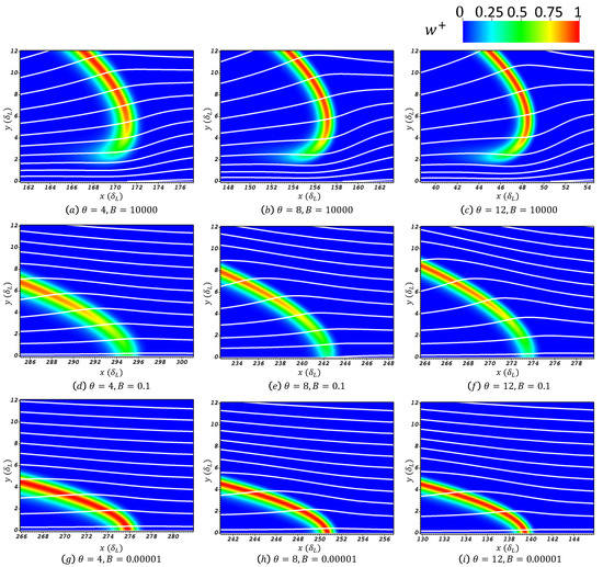 It is also seen that as the thermal expansion coefficient is increased, the divergence of the streamlines increases, indicating the increased propensity of the flame to modify the flow even in a critical condition. This tendency is most noticeable for the larger B (Figure 14a–c).
