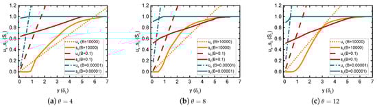 It is seen that with the increase of the heat transfer coefficient B, the height (y-coordinate) of the cross-point between and is increasing as well. It is noted that for , flame consumption speed is below wall for all considered. The results indicate that the concept of the critical gradient model (CGM) [] may, in principle, become inapplicable when the thermal resistance of the walls is high. Based on Figure 14 and Figure 15, it can be suggested that the influence of the thermal gas expansion on the flame-flow interaction is more significant at larger heat transfer coefficients B.
