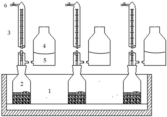 Schematic diagram of batch tests: 1—water bath, 2—reactor, 3—burette/eudiometer, 4—bottle, 5—barrier liquid, 6—valve.