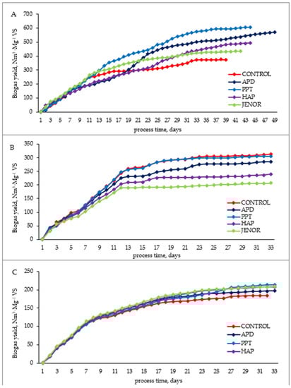 For grass silage, the highest yield of biogas, 312 Nm3·Mg−1 VS, was obtained in the control reactor. A similar biogas production result was obtained after the application of the PPT®, amounting to 306 Nm3·Mg−1 VS (the value lower by about 2%). The use of APD®, HAP®, and JENOR® caused a decrease in the production of biogas, at 177 Nm3·Mg−1 VS, 240 Nm3·Mg−1 VS, and 207 Nm3·Mg−1 VS, respectively, which were about 9%, 22%, and 34% lower than the results of the control reactor. The use of the additives APD®, PPT®, HAP®, and JENOR® led to increases in biogas production from igniscum silage of 6%, 16%, 12%, and 13%, compared to the controls. With the addition of PPT® to the reactor with maize silage, production of biogas at the level of 607 Nm3·Mg−1 VS was obtained, which was 62% higher than that of the control without supplementation. This result is very important because maize silage is one of the most popular substrates in agricultural biogas plants. The production of biogas with the addition of APD® amounted to 572 Nm3·Mg−1 VS, which was 53% higher compared to the production of biogas without added enzymes. The biogas values obtained with the use of the additives HAP® and JENOR® amounted to 495 Nm3·Mg−1 VS and 436 Nm3·Mg−1 VS, which were 32% and 17% higher, respectively, than the results achieved using the method without supplementation.