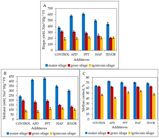 Summary of biogas and methane yields from selected silages using different additives: (A) biogas yield, (B) methane yield, (C) methane content.