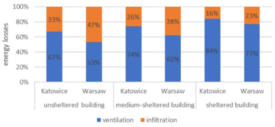 Percentage share of ventilation and infiltration heat losses in total heat losses for ventilation of a building with n50 = 0.63 located in two cities of Poland for different sheltering conditions [23].