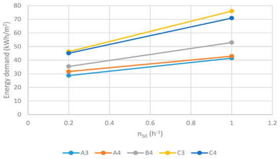 In [27] the importance of airtightness on the energy consumption of social buildings built in the years 1950–1979 in Spain (different variants of the Mediterranean climate) was analysed. The impulse for the research for the authors was, among others, the quote of almost the highest value in Europe of the number of mortalities associated with winter weather. The authors link it with the low quality of social housing in Spain, which was in force before the changes in the legal requirements regarding the quality of the building envelope. Their research results showed that in regions with more severe climates, air leaks are responsible for an additional consumption of more than 10 kWh/m2/year. It was calculated that an increase in airtightness by 0.1 h−1 would reduce annual heat demand by 5% in warmer zones and by 7.2% in the colder regions of Spain. Their results are presented in Figure 5.