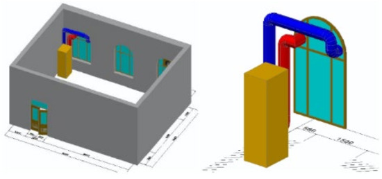 Due to the need to make openings in the outer partition, it is not always possible to use reversible fans. An example would be a historic school building where there was a problem of high CO2 concentration during lessons [62]. The authors proposed masking channels in the window opening (Figure 9), which made it possible to maintain not only the CO2 concentration at the assumed level of 1200 ppm, but also the proper radon concentration. In addition, the use of a heat-recovery exchanger allowed the authors to obtain the desired air temperature in winter, which was impossible when ventilating classrooms during breaks.