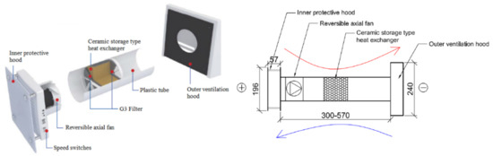 Decentralized ventilation unit with reversible fan and ceramic heat exchanger [69].