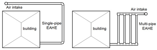 - Qi, D.; Li, A.; Li, S.; Zhao, C. Comparative Analysis of Earth to Air Heat Exchanger Configurations Based on Uniformity and Thermal Performance. Appl. Therm. Eng. 2021, 183, 116152. [Google Scholar] [CrossRef]