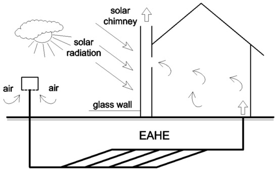- Pouranian, F.; Akbari, H.; Hosseinalipour, S.M. Performance Assessment of Solar Chimney Coupled with Earth-to-Air Heat Exchanger: A Passive Alternative for an Indoor Swimming Pool Ventilation in Hot-Arid Climate. Appl. Energy 2021, 299, 117201. [Google Scholar] [CrossRef]