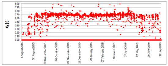 As a result of their research, they found that the efficiency of heat recovery provided by manufacturers may differ significantly from what will occur when working in real conditions. This may affect the results of the building’s energy performance calculations. In the case of the tested unit, the manufacturer gave an efficiency of 85%, while the tests obtained a range of 20–50%, which was related to the pressure difference. High efficiency (73%) occurred at a pressure difference of 0 Pa, and a high efficiency of 85% only in the initial period of the fans’ work cycle.