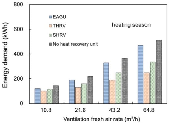 The energy demand for ventilation results from the need to heat the supply air stream and the stream that infiltrates from the outside through leaks in the building envelope. It has been proven that the heat losses resulting from these air flows depend in particular on the type of ventilation system and the airtightness of its partitions [11,12]. In existing buildings, which generate more than 40% of the global energy demand, modernization is necessary, including the introduction of modern solutions that aim to reduce energy demand while ensuring the quality of the internal environment [5,13,14]. A reply to the frequently increasing share of heat demand for ventilation in the total heat demand of a building is the utilisation of advancements in ventilation systems such as demand-controlled ventilation as a ventilation-control strategy, elements of decentralized ventilation, earth-to-air heat exchangers, and heat recovery from exhaust air.