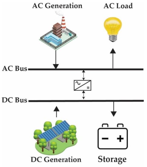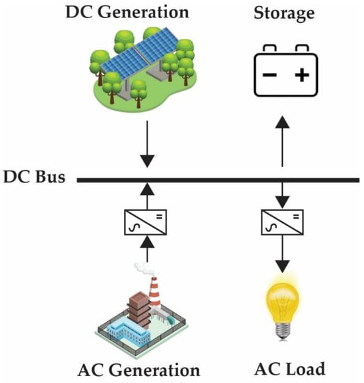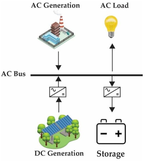 A typical AC bus configuration is shown in Figure 6, and it is the opposite of a DC bus configuration. This type of architecture requires higher voltage, which results in lower losses. REs largely supply direct DC, and it becomes less economical to first convert the power of REs into AC before supplying it to the central busbar; therefore, this type of configuration is found in few reach papers [38,39,40,41].