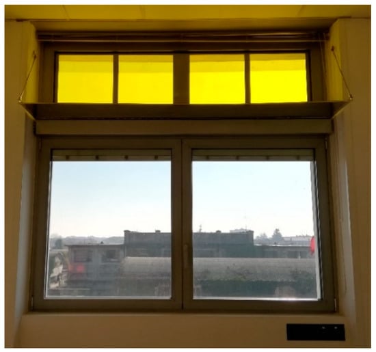 The upper window is semitransparent, since it integrates four LSC modules, 50 × 50 × 0.6 cm each, installed inside a double glazing. The lower window is a normal double-wings window with a double-glazing filled with air. The frame of the whole structure is made with thermal break aluminum profiles. The upper and lower parts of the window are divided by a horizontal, highly reflective, aluminum shelf, which extends from the inside to the outside of the building. The shelf helps to mix the colored light that passes through the LSC panels with the clear light that passes through the neutral glass below, in order to obtain a natural light characterized by a lower color temperature [26]. Solar control is achieved through metal venetian blinds, placed inside the double-glazing of the lower window, adjustable according to the conditions of the sky and the irradiation level. The movement of the blinds is driven by electric motors (DC motors), one for each wing, integrated into the window frame and powered by LSC panels. In order to guarantee electrical conservation and continuity of operation even during days with low solar radiation, the SW is equipped with two batteries, incorporated in the frame. The shutters’ movement is guided by an external sensor (a light/radiation meter) connected to a computer with an adaptive control logic, which allows for the best setting in terms of interior comfort and energy saving, without the intervention of the inhabitants. Since the modules produce energy even with diffused radiation thanks to the use of storage batteries, the system guarantees operation even for several cloudy days [26].