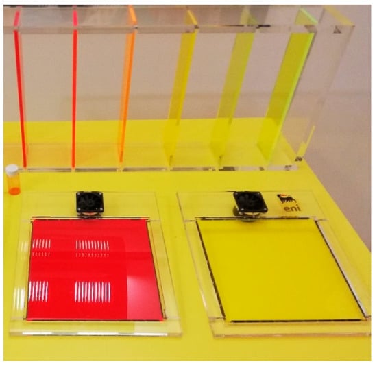 The LSC modules are the main hub behind this operation. LSC components (Figure 2) consist of a transparent matrix of polymeric material doped with a luminescent dye (fluorophore). The transparent matrix acts as a waveguide and it is made in the form of a slab. The fluorophore allows the absorbing and re-emitting of incident solar radiation, while the waveguide concentrates it towards the edges of the slab; here, small photovoltaic solar cells convert solar radiation into electrical energy. The photovoltaic cells are glued on the edges of the slab and they are protected by a perimeter frame; they can be connected both in series and in parallel, according to the specific needs of use.