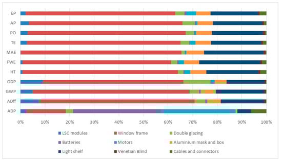 It should be noted that the LSC modules, which represent one of the main elements of the system, provide a low contribution in all categories, from 0.39% (HT) to 4.82% (ODP). However, it is useful to report the relative impact of the various components of LSC modules, which is shown in Figure 4.