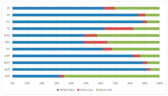Considering the LSC module, the major contributors in all categories (except ADP) were PMMA slabs (from 32% (ADP) to 91% (ADP fossil fuel), followed by the photovoltaic cells (from 6% (ADP fossil fuel) to 65% (ADP)). The contribution of the dye was lower than 8% in all categories, except fresh water ecotoxicity (16%) and terrestrial ecotoxicity (20%).