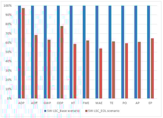 Comparison between Base scenario and Recycling (EOL) scenario for the SW–LSC.