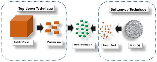 - Abid, N.; Khan, A.M.; Shujait, S.; Chaudhary, K.; Ikram, M.; Imran, M.; Haider, J.; Khan, M.; Khan, Q.; Maqbool, M. Synthesis of Nanomaterials Using Various Top-down and Bottom-up Approaches, Influencing Factors, Advantages, and Disadvantages: A Review. Adv. Colloid Interface Sci. 2022, 300, 102597. [Google Scholar] [CrossRef]