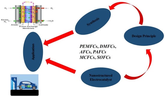 A highly effective and rational design of a nanostructured-electrocatalyst material is of high importance to a sustainable electrochemical-energy system. When a nanostructured electrocatalyst material is designed at a nanoscale dimension, it should provide benefits, such as short pathways for charge transport, good accommodation of strain electrode arising from the electrochemical reaction, and not allowing new reactions with mass material [39,40]. The use of nanotechnology to improve sustainable-energy conversion is of great importance. The fuel-cell technology is a sustainable energy-conversion system that relies on electrochemical reactions to produce electrical energy [41,42,43]. Nanostructured materials have brought many ways through which fuel-cell technology can be improved. The introduction of nanostructured electrocatalysts will bring about a rapid increase in the efficiency of fuel-cell technology [44]. This paper summarizes some of those benefits, their importance, the knowledge gap, and the way forward. Energy conversion in fuel cells involves chemical interaction at the surface or interface. Therefore, the properties of nanomaterials will play a big role in bringing about highly efficient energy conversion in fuel cells. An ideal nanostructured material that should be used for electrocatalysis will be cost-effective and possess all the following qualities [45,46]: high porosity, high area of contact between the electrodes and the electrolyte, high thermal and chemical stability, high ions and electron mobility, high durability, and a large surface area.