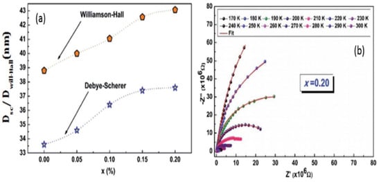 (a) Average crystallite size from the Debye-scherer and Willianson-Hall methods for [(La0.8Ca0.2)]1xBixFeO3 (b) The Nyquist diagram for [(La0.8Ca0.2)]1xBixFeO3 [27].