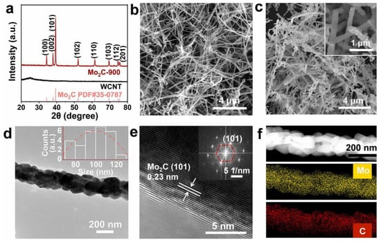 (a) Mo2C-900 and WCNT XRD patterns; (b) WCNT SEM image; (c) Mo2C-900 SEM images; (d) TEM image (inset showing Mo2C particle size distribution); (e) HR-TEM image (with inserted pattern of FFT); (f) Mo2C-900 EDS elemental maps [80].