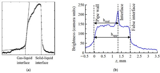 An alternative way to separate the true and false image is to use a modified laser sheet. In [], it was noticed that straight shadows cast by non-uniformities of the pipe are broken at the true interface (see Figure 4a). In [,], a structured (periodically blackened) laser sheet was employed to detect the true interface based on the breaking shadows (Figure 5). The main drawback of this approach is an effective coarsening of spatial resolution in the direction of the laser sheet, since the film thickness measurements are actually only obtained in the blackened areas.