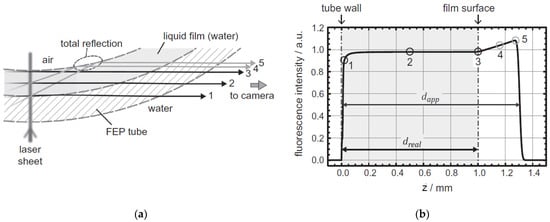 - Though the laser light passes only within the sheet, the fluorescence is emitted in all directions. The rays emitted directly into the camera create the true image of the film in the camera matrix. However, the rays emitted in other directions may be reflected by the interface between the laser sheet and the camera into another region of the camera matrix, creating a false film image. For the case of a circular pipe flow and θ = 90°, the calculation of such rays and created true and false film images are shown in Figure 3 []. If the angle of incidence of a ray creating the false image is close or larger than the angle of total internal reflection (referred to as the TIR-angle, which is around 48° for water-air interface), the false image will have the same brightness as the true image. The false image is adjacent to the true image and it is nearly impossible to distinguish between them based merely on the local brightness level. For the film with a constant thickness, the false image width is approximately 30% of the true image, see Figure 3b []. This phenomenon could be treated as a false-positive error of film identification and overestimation of the film thickness. Sometimes, either a bright or dark line can be seen in the images, marking the position of the true interface [], see Figure 4a. However, this is not always the case. At lower θ, the false image will increase substantially []. Decreasing θ below the TIR-angle may help to darken the false image [,], sacrificing the spatial resolution and the sharpness of the image border. For a flat film on a plate, illuminated by a laser sheet normal to the interface and observed under an acute angle θ, the false image will be of the same size as the true film image. Fortunately, if θ is smaller than the TIR-angle, the false image will be much darker, and the true interface could be detected (see Figure 4b). This is why low θ of 30–35° was used in [,,] with the same drawbacks.Figure 3. The distortion of PLIF measurements in a pipe due to mirror effect (θ = 90°): (a) Rays leading from the glowing section of liquid film to the camera. Rays (1–3) go to camera directly, whilst rays (4–5) go to camera after total reflection at the interface []; (b) The modeled distribution of registered fluorescence intensity created by rays from 1 to 3 (true film image) and rays from 3 to 5 (false film image) [].Figure 4. Raw PLIF images illustrating the mirror effect: (a) Falling film in a pipe under θ = 70°. The true and false film images are separated by a bright line; they are of different size but the same brightness []. Shadows cast by pipe non-uniformities and broken at the bright line can be seen; (b) Falling film on a plate under θ = 35°. The true film image is bright; the false film image above it is about the same size but much darker [].