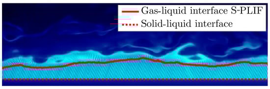 It is also important to understand that the apparent (true + false) film image does not physically correspond to the true film image stretched, e.g., 1.3 times. The false image is actually the true image turned upside down and compressed. The true image of the interface remains inside the apparent image. Besides, the dark part of the PLIF-image “above” the film image does not show the gas area above the illuminated film section: it appears due to total internal reflection of the rays leading to the camera outside the pipe. This, in particular, means that the phenomena such as the droplet entrainment or wave overturning cannot be seen using PLIF through a pipe wall. Some more detailed analysis is provided in [].