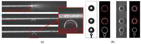 As mentioned, the PFBI technique is based on the registration of fluorescent light from a dye added to the liquid and illuminated by a laser sheet, while the radiation from the laser is ignored. The dye emission is isotropic since fluorescence is a diffuse process and occurs at longer wavelengths than that of the laser light due to energy losses. The local intensity of the dye radiation is proportional to the local intensity of the incident light (dye concentration is assumed to be uniform), but significantly less than that of the laser sheet. Thus, the laser sheet propagating through the dye solution forms an “emitting layer” consisting of the dye molecules radiating light at greater wavelengths than that of the laser. The bubbles located close to the central plane of the “emitting layer” (i.e., that of the laser sheet) cause bright rings in images (see Figure 7b) of the registering camera due to the reflection and refraction of the diffusive fluorescent light (see [] and examples in []). If an appropriate optical filter is mounted on the camera lens to suppress the laser emission, an analysis of these ring images can be performed to detect the bubbles located in the vicinity of the central plane. The bright ring images are formed predominately by the scattered light of the thin layer by the spherical interphase. Thus, the ring diameter is smaller than that of the bubble. For the 90° orientation of the camera (normal observation), the angles of incidence and reflection corresponds to 45° resulting in the ratio between the observed ring diameter and actual bubble diameter of approximately 0.71 (see Figure 7b).