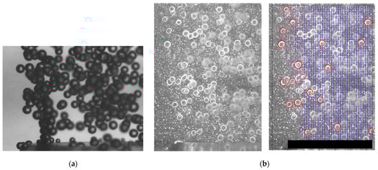 Apart from pointwise measurement techniques, such as the electro-diffusion method [] and widely used optical fiber probes, there is a number of non-intrusive optical techniques for the planar diagnostics of two-phase flows. The Shadow photography [,] Technique (ST) is used extensively for the measurements of locations and shapes of bubbles when the bubble shadow detection faces no difficulties. The main advantage of ST is that it can be easily combined with Particle Image Velocimetry (PIV) or Particle Tracking Velocimetry (PTV) techniques, when fluorescent tracers are used for the seeding of the carrier liquid phase. Such a combination requires two (or even more) cameras with appropriate optical filters and a diffusive light source (e.g., LED-array with a diffusive screen) with an emission spectrum at distinct wavelengths than that of the laser source and those of fluorescence by the tracers. The combination of ST and PIV-LIF allows for the detailed study of the dynamics of bubbles and their interaction with liquid. One of the main problems faced in ST is the overlapping of bubbles on images when void fraction is high enough. Nevertheless, the ST has been used extensively for bubble detection in narrow column or channel flows for volumetric contents of gas fraction up to 10%.