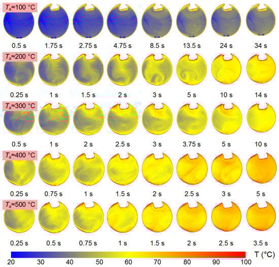 Temperature fields for suspended spherical water droplets (Rd ≈ 1.6 mm) in hot air flow (Ua ≈ 3 m/s) with temperature in the range of Ta = 100–500 °C.