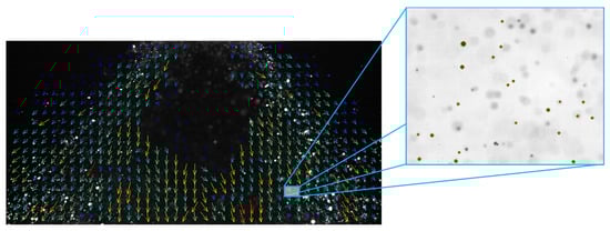 An example of PIV measurements in a cone spray. Inset shows the example of high-resolution droplet imaging using ST method for the same spray.