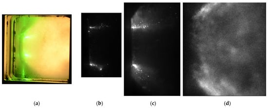 Another alternative technique for the imaging of round bubbles in comparison to the approaches mentioned above is a Planar Fluorescence for Bubbles Imaging (PFBI) method, introduced in []. This method is based on the laser sheet illumination of a certain plane in the liquid flow with solved fluorescent die. The imaging is performed in the range of the fluorescence wavelengths and the laser light, scattered by the bubbles or other obstacles, blocked by an optical filter. Thus, the fluorescent light, which is emitted by the dye in the illuminated layer and reflected and refracted by the bubbles located close or inside the laser sheet, is imaged (see the examples in Figure 7a for laser beam illumination). An important advantage of the PFBI method is that the bubbles located away from the measurement plane become defocused rapidly. This circumstance allows for retrieving experimental data in a certain rectangular measurement volume with a low thickness (typically, it is about the laser sheet thickness). Due to this fact, the PFBI method for bubble imaging can be easily combined with PIV for tracers in the liquid phase.