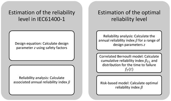 This section describes the methods and models used for estimating the annual reliability index and for estimating the optimal reliability level. An overview is given in Figure 1. The left side of the figure outlines the procedure used for estimating the reliability level in IEC61400-1. First, the design equation was used together with the safety factors to calculate the design parameter z. The reliability index was then calculated using Monte Carlo simulations based on a generic limit state equation. In both the design equation and limit state equation, normalized distributions were used for the resistance and load effect. This generic approach is typically applied for calibration of safety factors, as it eliminates the need for detailed design considerations, but it cannot be used for design, only for relative assessment where the normalized distributions provide the link between the design equation and the limit state equation [17]. The reliability indices calculated here were annual reliability indices in the first year of operation. Often, this is simply referred to as the annual reliability index with no mention of time, and this is sufficient to evaluate the maximum annual failure probability.