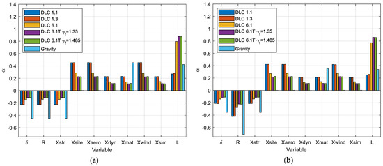For the three DLC 6.1 cases, the importance of the load variable L is larger than for DLC 1.1 and 1.3, especially for the typhoon load cases. This is explained by the larger COV for the load for DLC 6.1. However, since the characteristic value is taken as a 98% quantile of the load variable L, the characteristic value also increases. This explains why the reliability index can be slightly larger for DLC 6.1 extreme wind when compared to DLC 1.3 despite the safety factors being the same and the larger uncertainties for DLC 6.1. However, for DLC 6.1 with typhoon loads, the increase in characteristic value is not sufficient to keep the reliability at the same level, and the reliability is only sufficient when the increased safety factor is used but not when the normal safety factor is used.