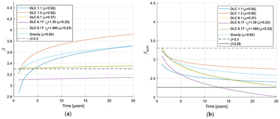 In Figure 3, the annual reliability index and the cumulative reliability index are shown as a function of time for steel. It is seen that the annual reliability index is almost constant over time for all three DLC 6.1 cases, where the correlation coefficient is quite low. When the annual reliability index is around 3.3, the cumulative reliability index almost drops to = 2.26, as expected for uncorrelated limit states. For DLC 1.1, DLC 1.3, and gravity loading, the annual reliability index increases drastically over time due to the high correlation. This means that the cumulative reliability index ends up being larger compared to the DLC 6.1 cases. For the typhoon load case without increased safety factor, the reliability index is low initially, and the cumulative reliability index after 25 years is the lowest among the considered cases. The high correlation for DLC 1.1, DLC 1.3, and gravity loading also has the effect that the average reliability indices are larger than the target .